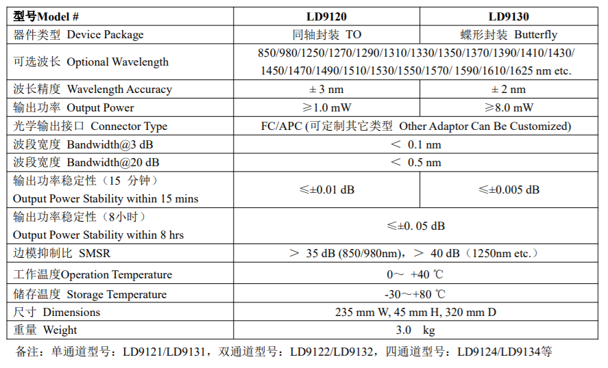 LD9124/LD9134 多通道DFB光源具有输出稳定性高,体
